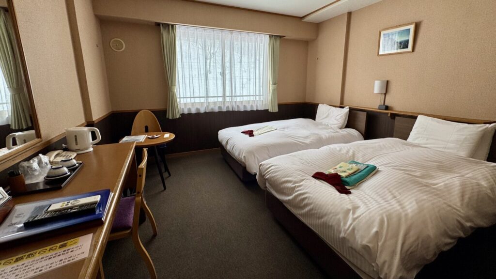 部屋はお任せプランで、ツインベッドの洋室へ案内していただきました。広くて清潔感があり、昔ながらの湯治場の雰囲気とは異なる、地方のリゾートホテルのような空間です。