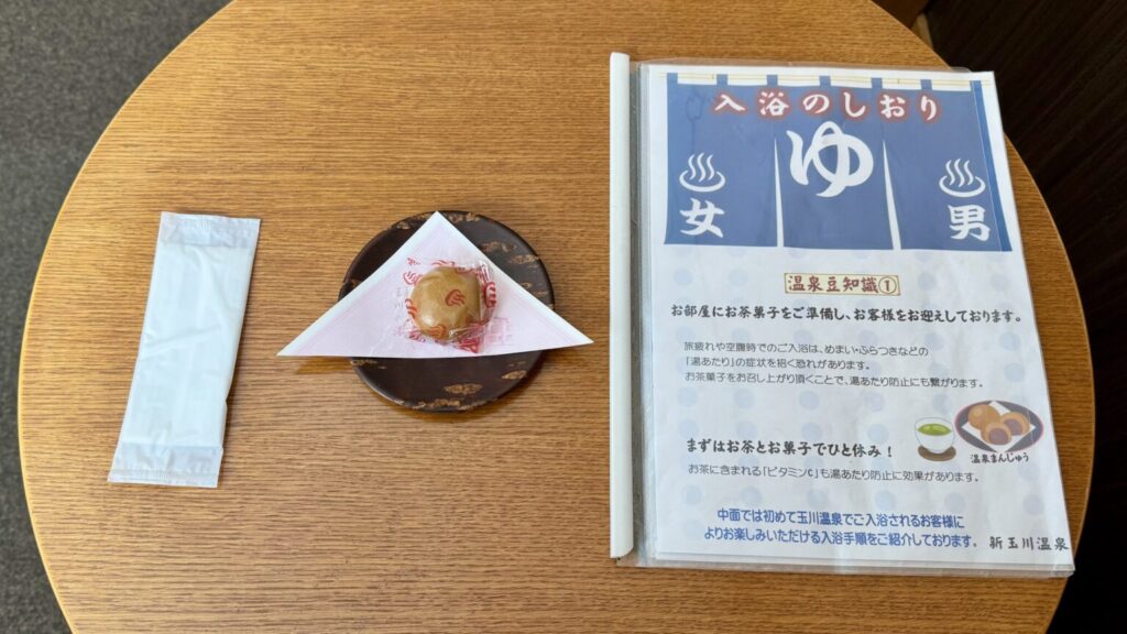 アメニティ・お茶・お茶請けの温泉まんじゅうも完備。コーヒーは部屋にはないので、ほしい場合は売店で購入できます。