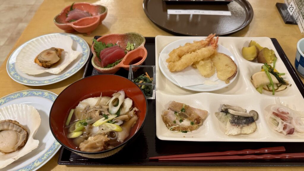 夕食はきりたんぽや比内地鶏のお茶漬けに八幡平で育てられた豚肉を使った激辛鍋など、秋田の名物がたくさん並ぶビュッフェ。この日のオープンキッチンでは海老とりんごの天ぷら、ホタテ焼きが提供されていました。