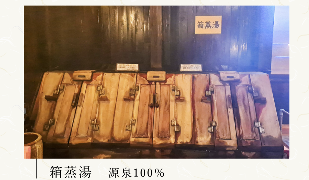 - 箱蒸湯:源泉100%の温泉が床下を流れ、その熱で温まる個人サウナ。冷え性の方に特におすすめ!(肌が弱くても入れる。わたしの大好きな浴槽)